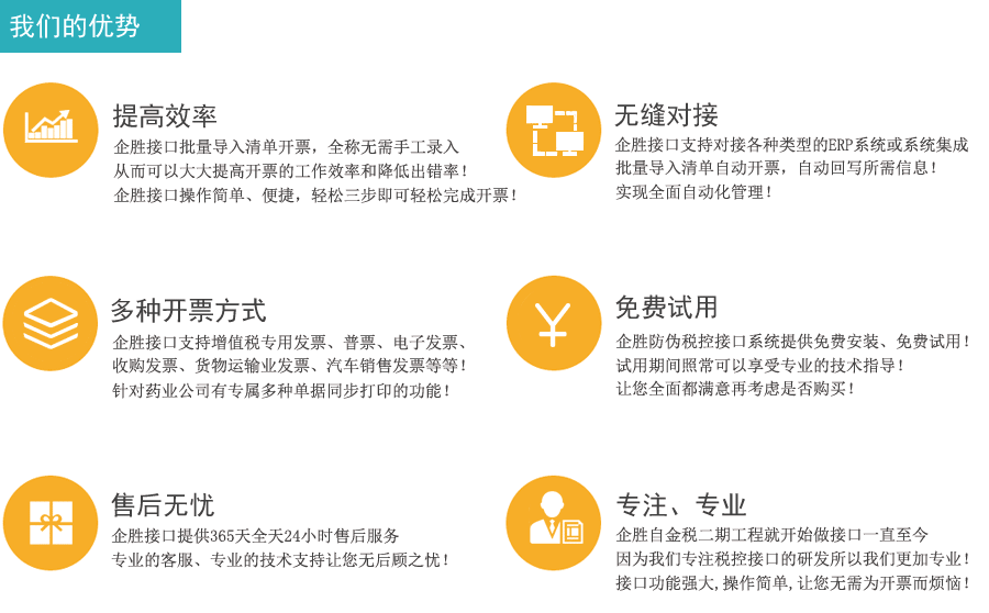 百望(百旺)税控接口可以支持Excel表格的清单批量导入,也可以支持TXT文本和XML格式文件导入,如果企业有ERP系统或者业务系统,百望(百旺)税控接口还可以直接跟ERP系统进行对接取数开票,这样在整个开票的过程中可以大大提高工作效率和降低手工录入开票的出错率!企胜百望(百旺)税控接口可以提供给客户免费安装试用,效果满意再购买,详情可以咨询线上客服!